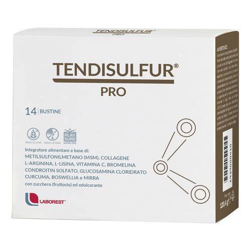 Tendisulfur ProDescrizione Integratore alimentare a base di MSM, collagene idrolizzato, L-arginina, L-lisina, vitamina C, bromelina, condroitin solfato e glucosamina cloridrato con estratti di boswellia, curcuma, mirra. La vitamina C contribuisce alla normale formazione del collagene per la fisiologica funzione delle cartilagini. Boswellia e curcuma sono indicate per il loro effetto benefico sulla funzionalità articolare. Ingredienti Metilsulfonilmetano (MSM), fruttosio, collagene idrolizzato suino, L-arginina, L-lisina cloridrato, vitamina C (acido L-ascorbico); acidificante: acido citrico; bromelina da gambo di ananas e.s. [Ananas c...